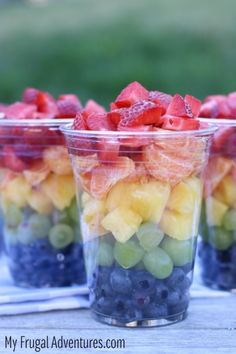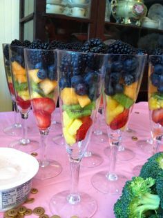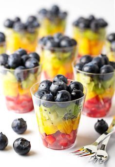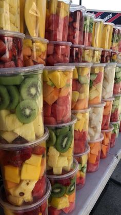 마지막 단계는 과일을 컵에 넣는 것입니다. 가지고 있는 모든 종류의 컵이나 용기를 사용할 수 있지만 안에 있는 다채로운 과일을 모두 볼 수 있는 투명한 컵을 선택하는 것이 좋습니다. 컵 바닥에 한 종류의 과일 층을 놓은 다음 그 위에 다른 층의 과일을 놓는 것으로 시작하십시오. 컵이 가득 찰 때까지 레이어링을 계속합니다.