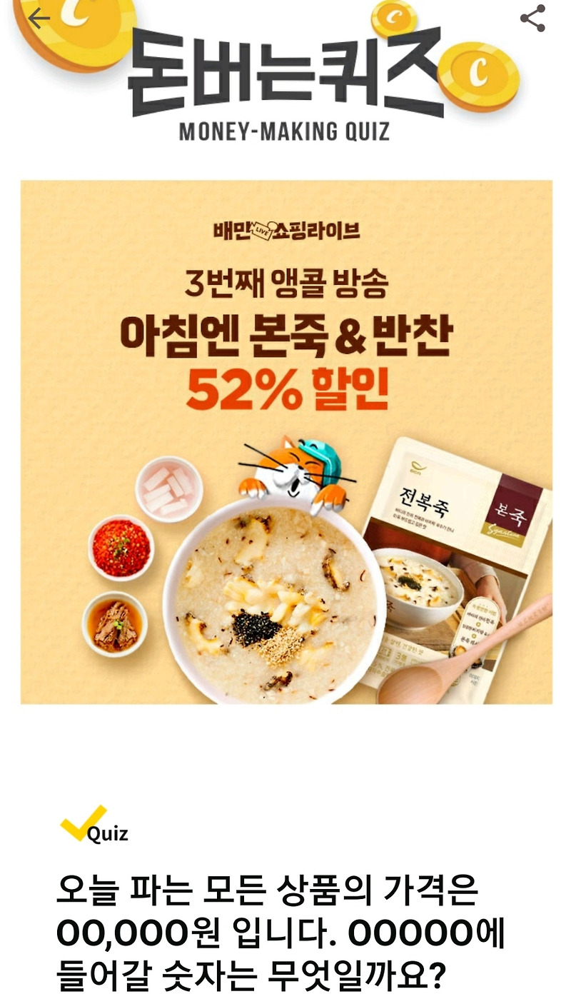 지난 5월 31일 다양한 업체들이 캐쉬워크 머니메이킹 퀴즈 APP을 통해 제품에 대한 질문을 던졌다. . 00% 할인. 여기서 00이 뭐지?” . 정답은 ’36’입니다. 오후 5시 30분에 공개된 농협 라이블리 한우 곱창 캐쉬워크 적립 퀴즈 문제는 “농협 라이블리의 라이블리! 한우 100%로 만든 한우 곱창! 콩가루를 넣지 않은 한우 곱창을 드시고, 31%의 할인은 출시기념 현장특가로 순한우 곱창 본연의 맛을 느끼실 수 있습니다. 0000000에 포함?” 정답은 “삼겹살 300g” 입니다.